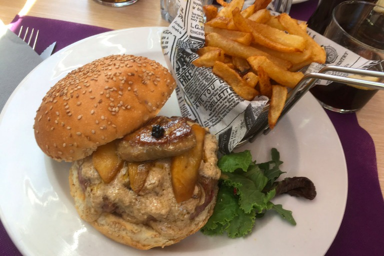 Pause déjeuner avec des hamburgers au foie gras accompagnés de frites maison.